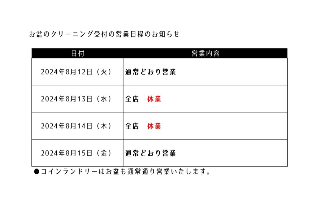 暑い日が続いておりますが、皆さまにおきましてはいかがお過ごしでしょうか、2025年もお盆が近づいてまいりましたので、お盆期間中のクリーニング受付の休業日程をお知らせいたします。