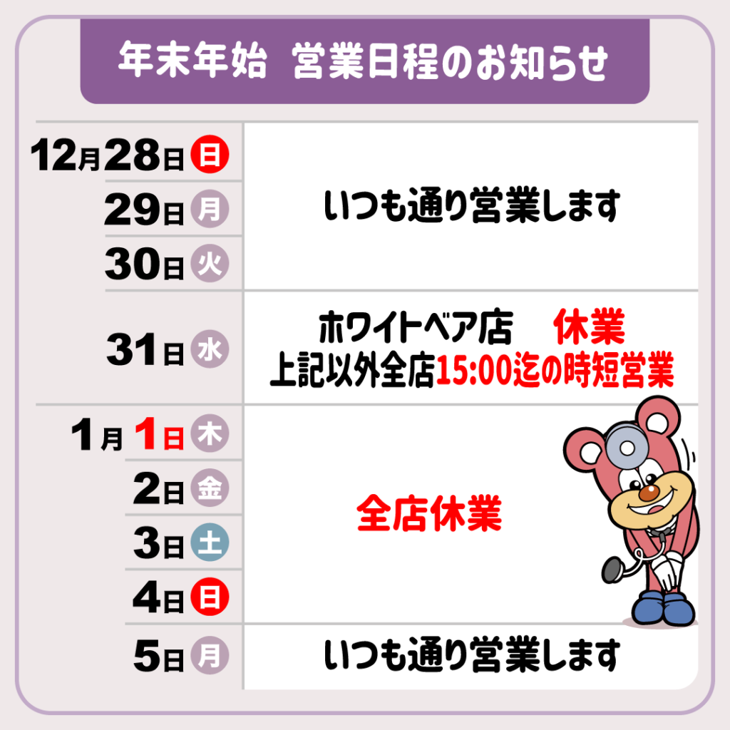 お客様におかれましては、営業日程をご確認頂き、お引取り忘れのないようよろしくお願いいたします。