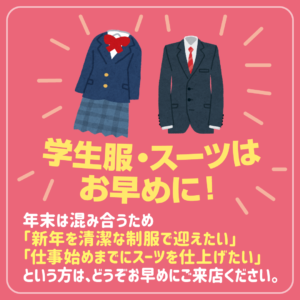 年始をキレイな服で迎えたいとお考えの場合は、年末は込み合うことが予想されるため、お早目にお出しいただくのをお勧めします。