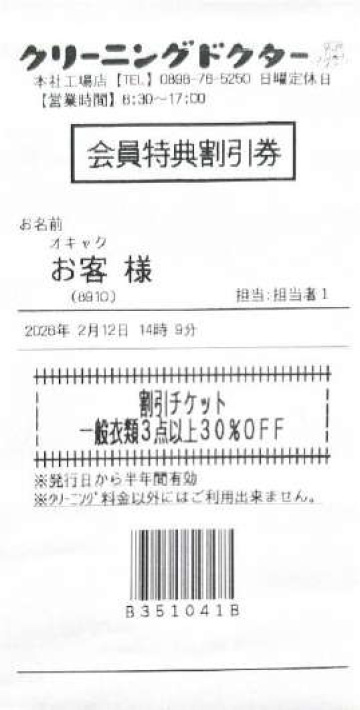 - ●発行日から半年間有効一般衣類クリーニング3点以上30%OFF割引チケットをプレゼント!!!
